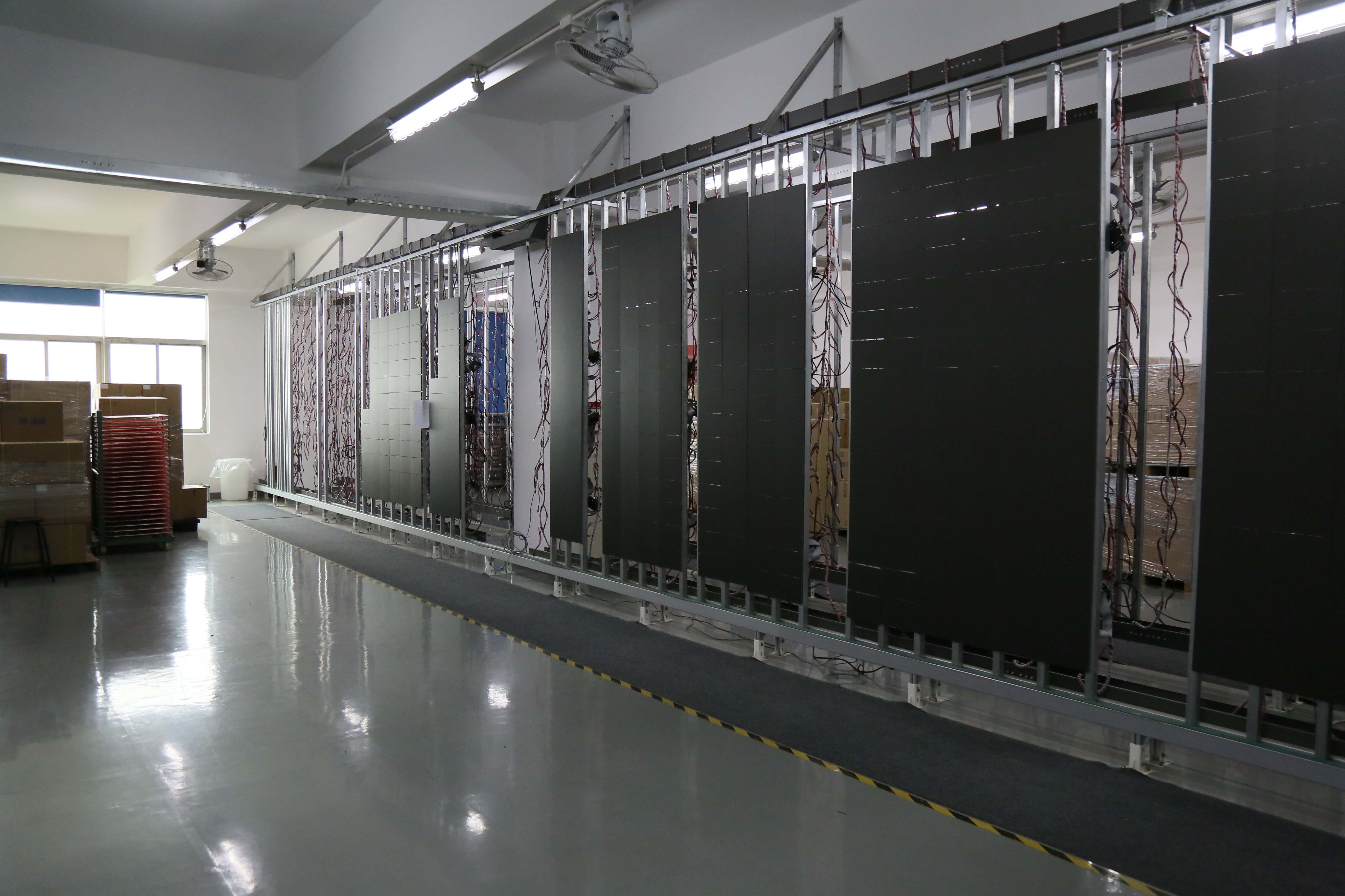 在二樓看完SMT生產(chǎn)車間,向總帶領(lǐng)大家來到四樓的展廳,展廳里有用LED柔性屏包成的圓柱屏,有P1.25的室內(nèi)小間距做的會議一體機、有P3的LED地磚屏、還有用COB 倒裝工藝做的P0.9的超小間距屏,整個展廳每塊屏結(jié)合應(yīng)用場景,他的尺寸大小和分辨率恰到好處;讓參觀者既能看到LED顯示屏顯現(xiàn)的實際效果,又能做到炫酷傷眼。展廳里排滿了定制的LED顯示屏箱體,也擺有像素點不一樣密度的模組。福興光電劉工向客人介紹箱體硬鏈接指的是室內(nèi)小間距顯示屏正反兩面都是鋁型材,電源線、信號線都是做好的子母接頭扣,正面箱體和背面箱體對扣就接好了鏈線,正面和背面看上去都是一個封閉的整體,通電,通信號就可以試用LED顯示屏啦。箱體軟鏈接指的是。室內(nèi)小間距LED顯示屏正面是箱體,背面的電源線、排線都需要一對一的單組鏈接,背面會看到有線。