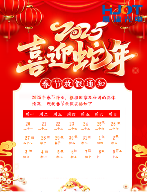 在過去的2024年里在大家的幫助下公司圓滿的完成業(yè)績目標,并在海外拓展開了新的業(yè)務(wù)。在這里祝愿你和你身邊的親朋友好友在新的一年里,所有的希望都能如愿,所有的夢想都能實現(xiàn),所有的等候都能出現(xiàn),所有的付出都能對現(xiàn),誠摯地祝福你,福氣多多,快樂連連,萬事圓圓,微笑甜甜。春節(jié)即將來臨,本公司2025年春節(jié)放假安排如下: