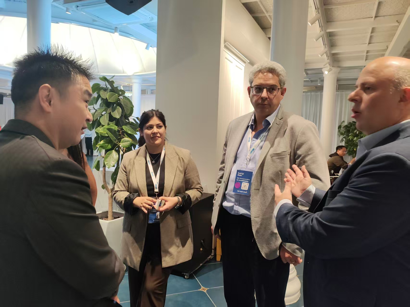 (圖片說(shuō)明:交流會(huì)后嘉賓合影。右一為科爾多瓦省商務(wù)局局長(zhǎng)Milena Acosta,右二為凰津光電HJOT 拉美事業(yè)部副總經(jīng)理黃志,中間為科爾多瓦外貿(mào)商會(huì)會(huì)長(zhǎng)Pablo De Chiara,左二為凰津光電HJOT 總裁向泓福,左一為科爾多瓦外貿(mào)商會(huì)副會(huì)長(zhǎng)ING.RODRIGO STEIN。)
